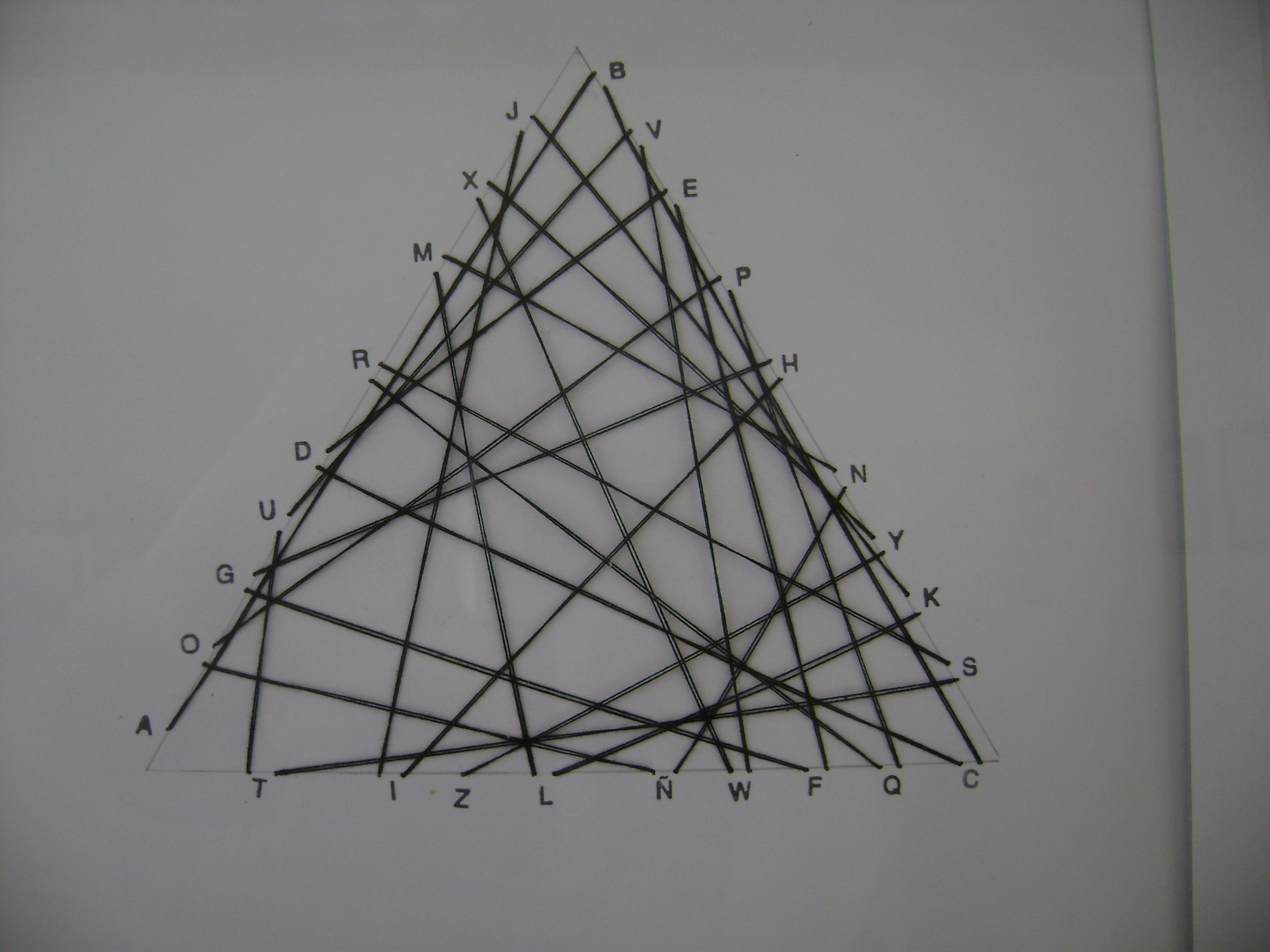 Presentamos en Ficción de la razón la obra «Ordenando el Alfabeto» (2007/2014), del artista argentino Pedro Miguel. Una (des)composición en la que el orden de las letras, y por ende de la posibilidad de articulación del lenguaje, queda expuesta a su potencia inacabable. En palabras del propio Pedro Miguel «Ordenando el Alfabeto es precisamente eso; en la búsqueda de ese «orden» se genera un caos visual, se crean planos y tensiones; se convierte en un «juego» de búsqueda desde la letra A a la Z. La serie está realizada en base a tres figuras geométricas elementales: triangulo, cuadrado y circulo».