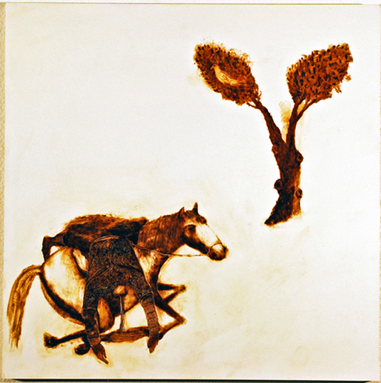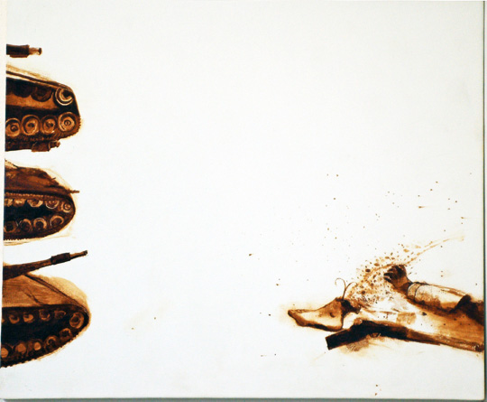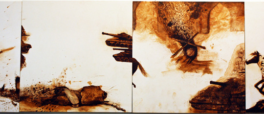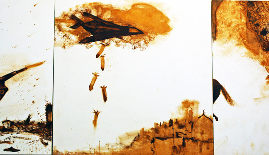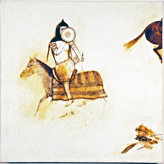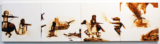 Presentamos en Ficción de la razón a la artista palestina Samira Abbassy y su obra Eternal War [Guerra eterna]. La combinación de elementos antiguos (guerreros a caballo, trompetas, armaduras) con otros modernos (aviones de guerra, tanques) deja como constante la muerte, la destrucción y la barbarie de la guerra. Es un relato crítico del martirio y de la historia de la guerra contada por sus vencedores. La obra se presenta en 4 sets de 12 piezas de oleo sobre paneles de yeso de 12×12 tituladas: 1. «Endless War»; 2. «The Eternal War II»; 3. «The Third Circle: The Taliban»; 4. «Fourth Circle: The Mujahedin».