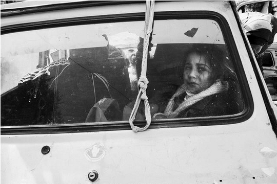 Pérdida y muerte, ojos de niña mirando no al infinito, como hacen los candidatos, sino hacia un lugar específico que sólo nos queda imaginar. En mi imaginación aparecen una casa destruida, un juguete olvidado en el apuro de la salida, una amiga que acaba de despedirse con la mano y un grupo de cuerpos que, ya sin vida, indican el movimiento catastrófico del propio automóvil por partir. En la fotografía, lo que no vemos resulta lo inquietante, lo que perturba la mirada. En los ojos de la niña y en la expresión de su rostro, nos encontramos con el espejo de lo inquietante. Rostro-espejo, siempre más allá de sí o del cuerpo en que imaginamos la consistencia.