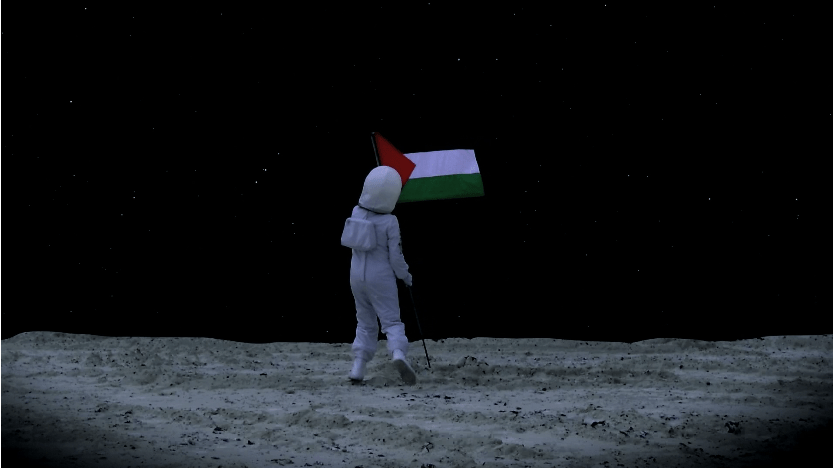 La artista palestina Larissa Sansour presentó en 2008 el corto Un éxodo espacial, donde ella misma interpreta a una astronauta palestina que llega a la luna. Inspirada en un pasaje de 2001: Una odisea del espacio (1968) de Sanley Kubrick, la viajera espacial inicia un nuevo éxodo, sin posibilidad de retorno, al tiempo que planta la bandera palestina en el satélite natural, creando una escena icónica.