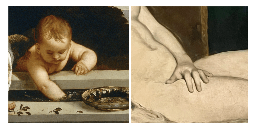 Hagamos una breve pausa. La mano ya no puede presumir de una distancia ante el misterio o lo sublime, algo que en Olympia (1863) se entiende de tal forma al punto de que termina extraviándose en un prometeismo dúctil que se apoya en el corpus de la figura. En realidad, este es su primer y último apoyo: la mediación pictórica de Olympia (1863) recoge la esencia articulada de una mano que ya no se encuentra sujeto a la inmediaciones de la hypsos – que como en el cuadro Amor Sacro e Amor Profano (1514) de Tiziano, hace posible que el putto hunda la mano en el agua de la fuente – que da lugar al resarcimiento tecnificado de las necesidades intrínsecas del homo faber: una mano dominante que desiste de la altura del cielo para pasar a comprimir toda su energía en la vitalidad del cuerpo viviente, su última casa. El brazo del putto que se hunde en las aguas del sarcófago de la tela de Tiziano ahora queda contenido por la obstinada materialidad de la superficie de la tela: soy un cuerpo pintado sobre tela. ¿Y no encontramos aquí la mano del pintor que prontamente entraría en crisis bajo el régimen expansivo de la liquidación de la autonomía del arte y de su negación carente de la laguna del hypsos? Tal vez la fuerza ejercida por los dedos nos dice algo a nosotros que no podía ser escuchado por los espectadores del París de los 1860s: a saber, la nominalización de una última mano de la cual depende todo acto creativo; la distancia infranqueable entre idea y acto. Allí donde la figura del trabajador manual anunciaría la civilización maquínica basada en el presupuesto técnico del homo faber, la mano de Olympia (1863), en su anclaje y retracción, prevenía el destino obsolescente de una especie humana sin trascendencia a lo sublime. Ahora lo sabemos ex tempore: Olympia (1863) es la realización de una época desembocada íntegramente a una experiencia mortífera sin tacto y sin pintura.