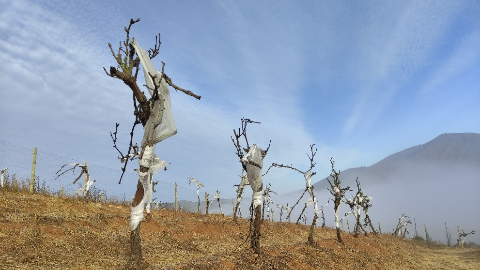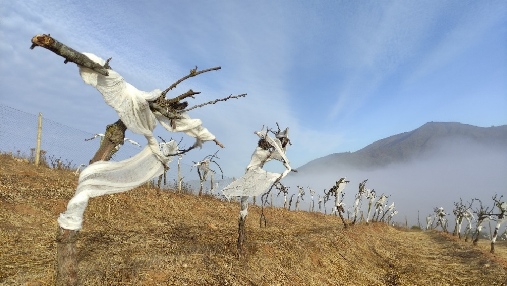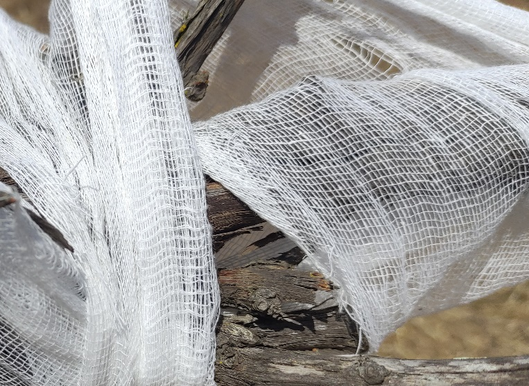 Sobre un terreno baldío de alrededor de 500 metros cuadrados, ubicado en el sector de Casablanca, Región de Valparaíso, esta instalación artística interviene 66 parras utilizando la leve materialidad de gasas quirúrgicas. En conversación que tuvimos la semana pasada, Janet nos cuenta acerca de su proceso creativo: “Las imágenes de Gaza, los crímenes, los cuerpos diseminados estaban constantemente presentes en mí y esa energía que generaban, la traspasaba a la obra. Además injerté a las parras, ramas de espinos, afirmadas con alambre fino. Fui poniendo la gasa, dialogando con cada parra y siguiendo la forma que me sugería la propia deformación que cada una posee. Así se conformó esta instalación, que aún sigue expuesta, recibiendo los embates del clima, de los animales silvestres, del viento…y que dejaré así hasta que algo cambie.”