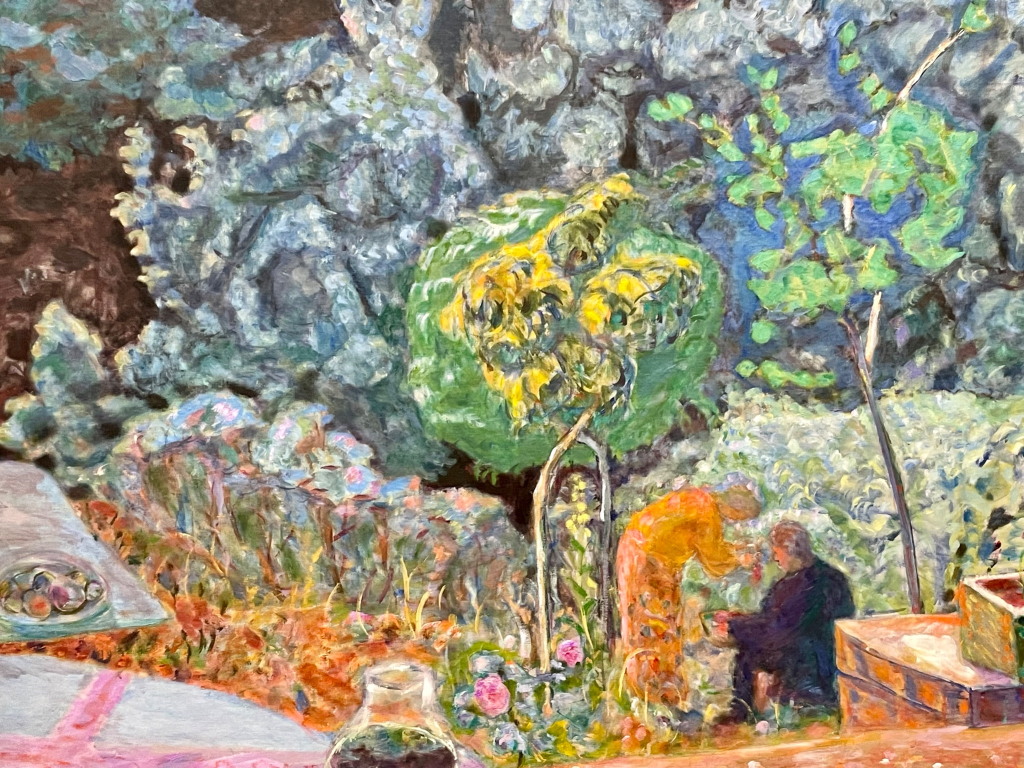 En Bonnard se registra, una y otra vez (ya sea en una ventana, en una chica tirada sobre la mesa del café, en un cuerpo que se asoma en una bañera, o en un jardín descuidado), la restitución de un ultramaterialismo que seduce en virtud de su permanencia sobre sí misma. Dicho de manera más cruda: en los cuadros de Bonnard hay mundos porque las cosas vuelven sobre nosotros; las cosas se amontonan, agrietan el espacio, hacen del espacio un pliegue, lo retuercen; a veces lo hacen hablar, o también enmudecer, todas las cosas irradian. Esto implica que el mundo solo es mundo como tapiz de “stuff”. De ahí la dificultad que presentan los cuadros de Bonnard. Incluso, se trataría de una dificultad de la mirada dotada para ver entre las cosas y lograr distinguirlas. El encantamiento mistérico revela su felicidad cuando podemos recortar una cosa como si fuese una haecceity plástica; y la prefiguración del color es índice de todo lo viviente. De hecho, desplegar la noción de color para describir la obra de Bonnard tal vez sea insuficiente, ya que no logra alterar la disonancia que provoca la dialéctica permanente entre lo cromático y figurativo. Esa disonancia pictórica mantiene el cuadro como instancia que resiste a la totalización de la forma.